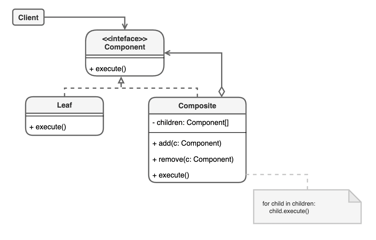 - Component: 클라이언트에게 제공하는 인터페이스입니다. Leaf, Composite에 필요한 주요 로직을 메소드로 정의합니다.