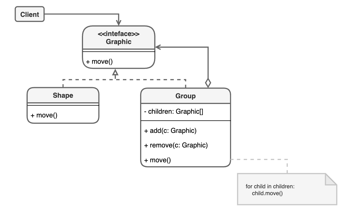 Graphic 인터페이스를 구현하는 단일 객체 Shape와 복합 객체 Group을 정의합니다. Group의 move를 호출하면 전체 하위 요소가 같이 이동됩니다.